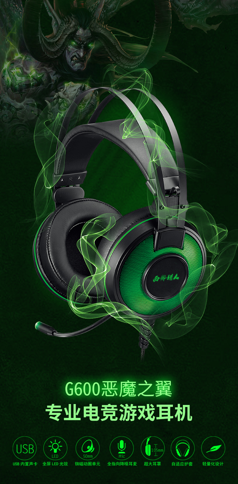 - USB连接,立体声,四声环绕,7.1声道,麦克风主动降噪,钛合金头梁